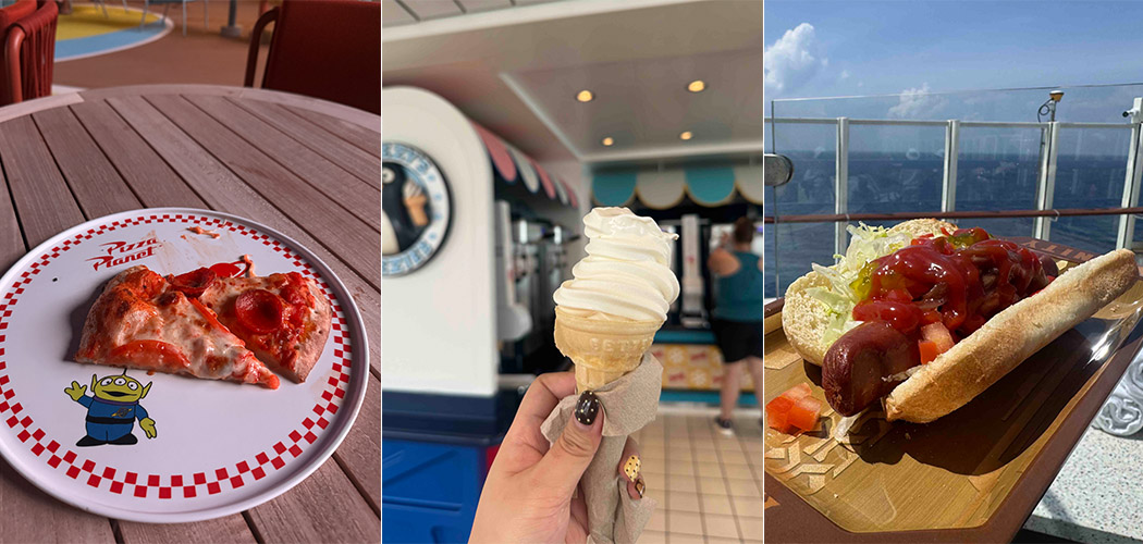 Want more food finds? Head to the Infinity Bar on Deck 18. Over there, they serve free hotdogs with toppings—a spot that most passengers completely miss! Also, don’t miss the limited Churro Mickey Waffles at the breakfast buffets, the Mickey Ice Cream Bars, which you can order at any restaurant on board, and the soft-served ice cream at Wheezy's Freezies.