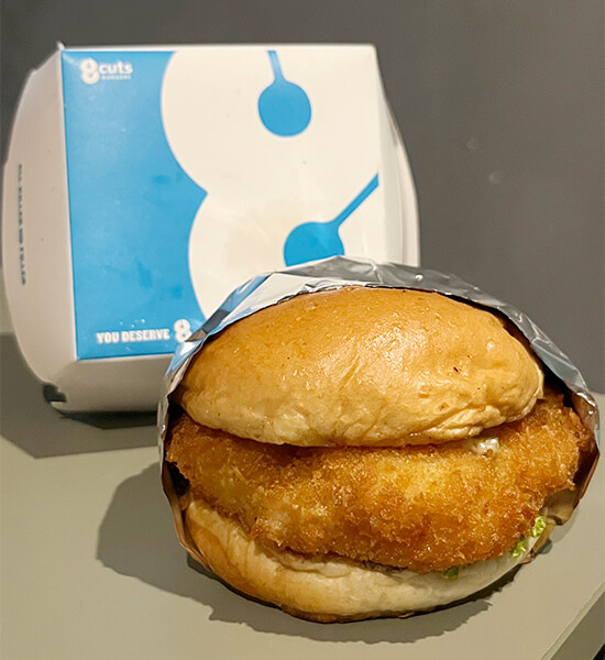 8 Cuts has three sandwiches you can choose from: The Falafel (chickpea patty with yogurt sauce), the Fish ‘Wich, or my pick, the Shrimp ‘Wich. This hefty sandwich (P380) consists of a whole shrimp patty, pickled jalapeño, housemade pickles, lettuce, jalapeño ranch sauce and brioche buns. It’s generous in shrimp and the jalapeño adds a nice kick. Pair it with 8 Cuts’ onion rings. They’re usually served with ketchup but I always order the house ranch to go with the rings.