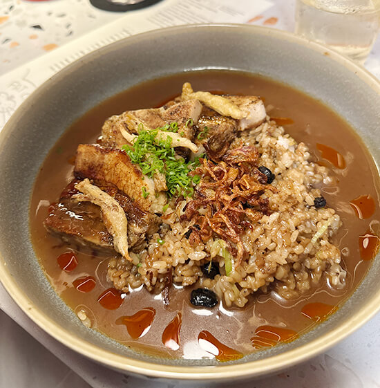 The Tower comes next. The original cocktail has smoky notes and is made of orange and gochujang. The dish is inihaw na baboy with smoked orange humba sauce (usually made with pineapple, here swapped for citrus), muscovado gastrique, tausi fried rice, fried banana blossoms, and gochujang oil.