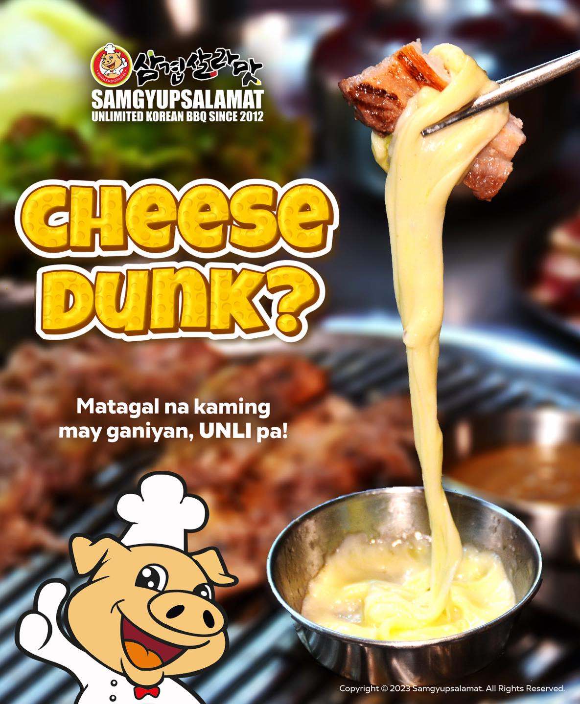 Samgyupsalamat also joined in the fun with a savage post on their unli cheese. “Cheese dunk? Matagal na kaming may ganiyan, unli pa!” they said, sharing a photo of one of their meat offerings dipped in some gooey cheese.