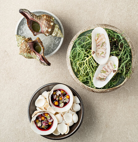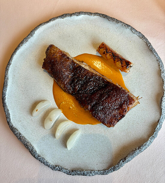 In the Abstract, diners were introduced to Gonzalez’s “Study into the World of Kabibe”—a marine trio of elephant clams, milk shell clams, and red sea snails, delicate and elemental, evoking both shorelines at once. From there, the Introduction traced Teoh’s “Coral Reef Equilibrium,” parrotfish dressed with selom (water dropwort) and oyster, a dish akin to kinilaw described as a meditation on the ocean’s balance. “The parrotfish,” we were told, “is a kind of meter for how healthy the corals are. They eat the algae that would otherwise choke the reefs.”