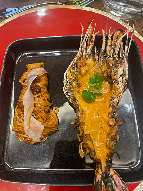 The second dish, a thick mud crab soup served in a lovely green bowl set amid branches of calamansi with fruit still on the stem, had us exclaiming with delight, and the Bulacan river prawn accompanied by a Hong Kong noodle pancit that followed was even tastier.