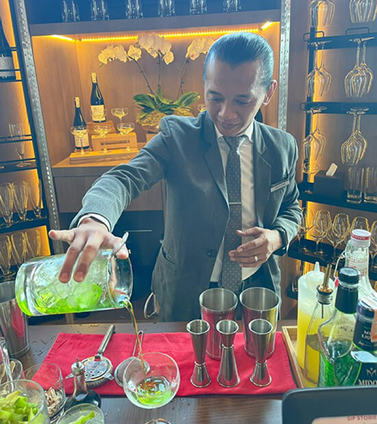 From there this star food event went from good to even better every step of the way. The real program started off with a trio of Hong Kong-themed cocktails concocted by bartender Sean de Vera, inspired by iconic sights and flavors of the former colony. He created a vodka tonic-based Avenue of Stars and captured the delights of tea in Yum Cha, served in a tea cup with a crispy palmier. There was a lovely, green-tinted cocktail based on the melon-flavored liqueur Midori, which he christened the Hong Kong Blossom.