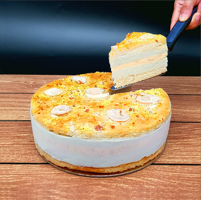 Auro Blanco Calamansi Tarta de Queso was inspired by Auro’s beloved Calamansi Cheesecake Chocolate Bar. To make it, Chele, who is passionate about local ingredients, used Auro White Chocolate, folding it into a creamy tarta de queso base with touches of calamansi. The cake is layered with spiced cookies and topped with a light spiced cookies frosting, Auro White Chocolate shavings and fresh calamansi zest.