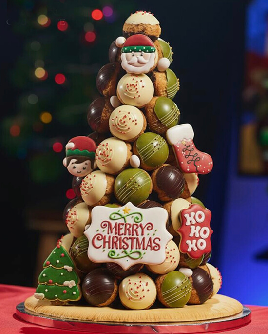 Choose from different designs—they have Christmas- and New Year-themed towers—and sizes or customize your own. Did you want a tower of 22 cream puffs? 32? 50? 96? 128? Want to add cookie sets or custom dedications? You absolutely can.