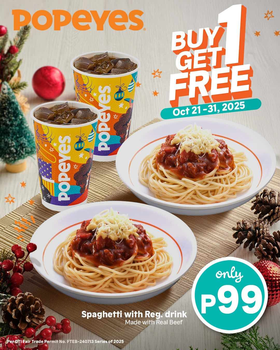 You can enjoy a Buy 1, Get 1 promo on Popeyes spaghetti with drink for P99 until Oct. 31