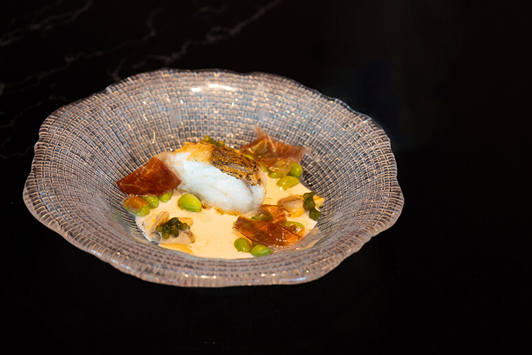 Next was a fish course—black grouper in a traditional Spanish green sauce made of white wine, garlic, parsley. The dish was made more complex by clams, edamame and jamón, a surprising combination of ingredients that come together beautifully.