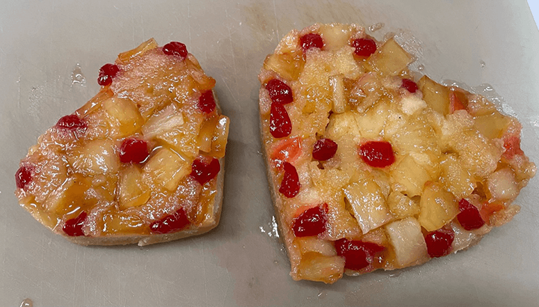 Pour on top of the pineapple and cherry design and bake at 350° F for 25-35 minutes or till center of the cake is set. Run a knife around the rim of the cake and immediately invert onto a serving plate.