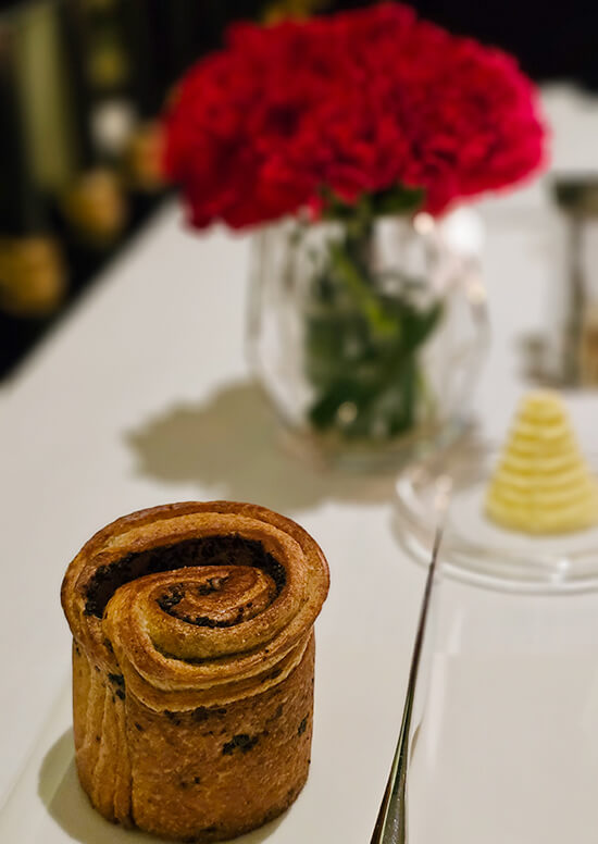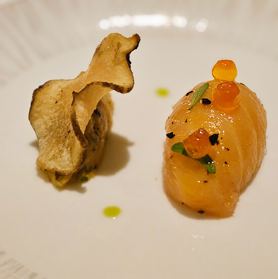 The elegant three-hour fine-dining experience began with a welcoming bubbly, nothing less than a Baron de Rothschild “Concordia” Brut Champagne NV (note that NV stands for non-vintage) served with amuse bouche selections, the first with a lightly salted fish roe I can only find in Paris called tarama in a bite-sized cannoli with caviar, and the second, a smooth salmon mousse with Jerusalem artichoke.