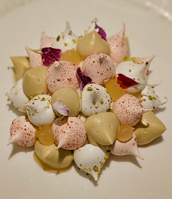 Le Vacherin, Millie’s kind of dessert, arrived soon after. It was a ricotta gelato and lemon gel, covered in drops of meringue and Sicilian pistachio Chantilly cream. This was paired perfectly with the Pizzolato Moscato Dolce “Muse” Veneto NV.