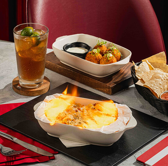 The experience begins with lighter bites such as Sweet Potato Crisps or a Refreshing House Salad, alongside newer options like the Rancho Tostada. Those looking for something more indulgent can opt for add-ons like Potato Croquettes or Loaded Chicken Cheese Bites.