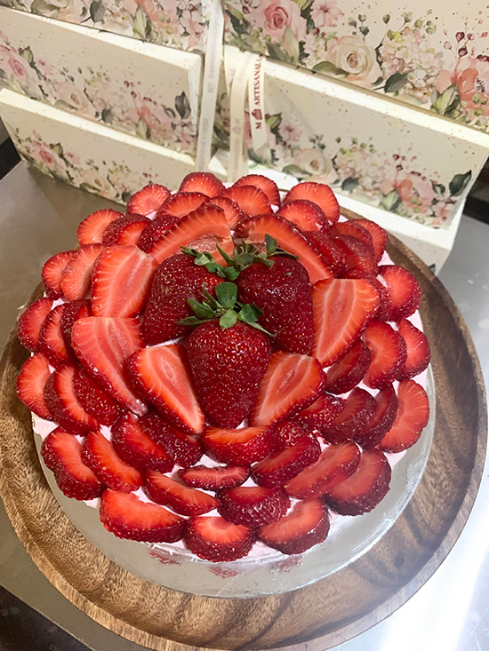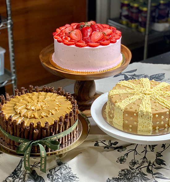 For celebrations, most of her clients order The Grand Slam, a decadent dessert made from chocolate cake topped with caramel and wrapped with Belgian chocolate-filled wafers. Personalized celebratory toppers that add a festive touch can be ordered, too.