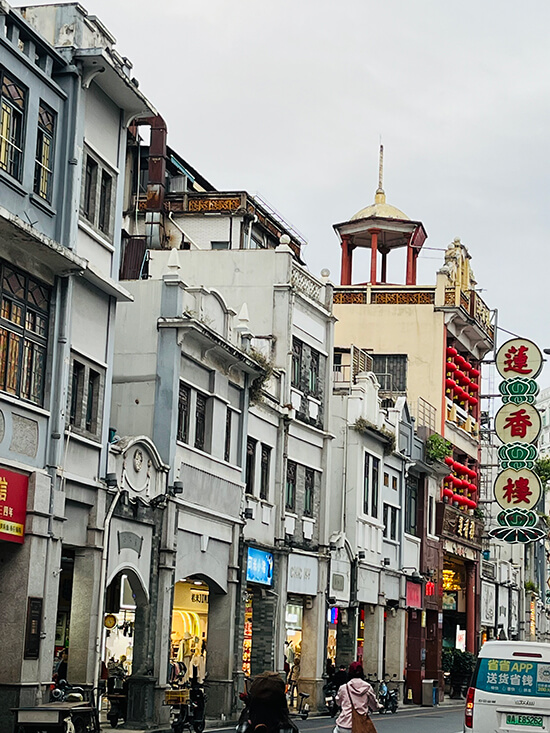 Walking towards Enning Road, we saw charming alleyways and canals with interesting craft shops that lead to the main avenue’s qilou arcaded buildings featuring more of the Xiguan style, preserved but repurposed for retail establishments and restaurants. Just as eye-catching as the walkways of columns, ornate facades, detailed carvings and colored windows were the merchandise from both traditional and modern shops.