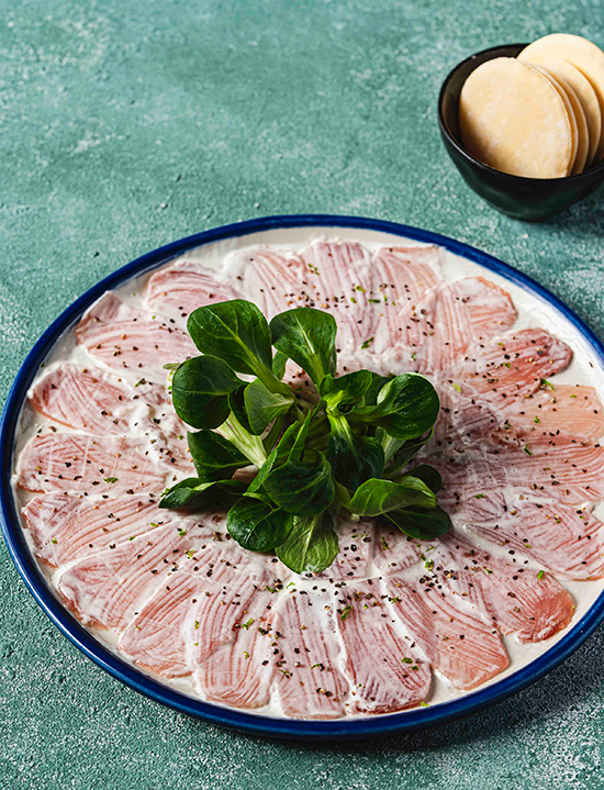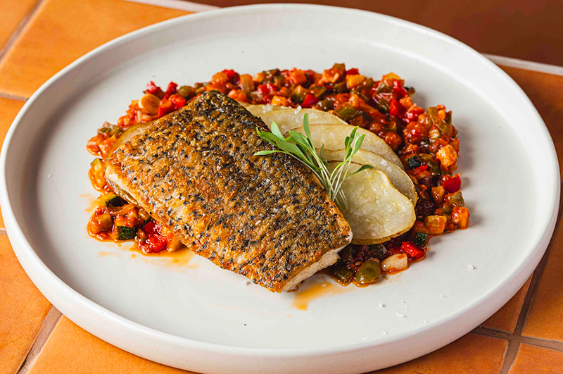 Next up is a crispy black sea bass “Basquiase,” pan-seared and served in a pisto (“like a Spanish ratatouille,” says Nikkei Group partner Jorge Joseph), with thin-diced confit potatoes and vegetables in a tomato sauce, harking to a more Mediterranean diet.