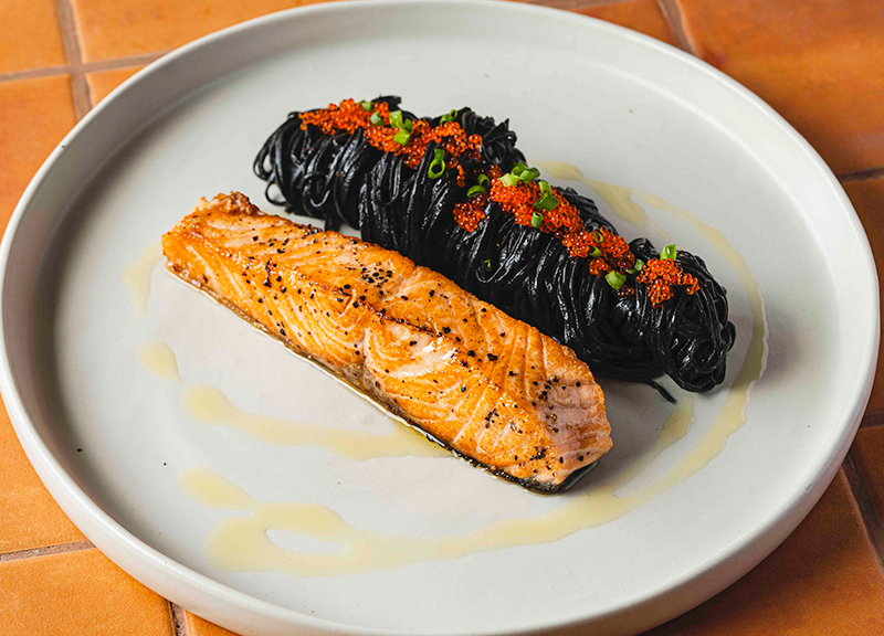 Simultaneously, we’re served a grilled salmon with dashi butter and seafood spaghetti infused with squid ink for “more umami” and topped with tobiko (flying fish roe) and chives.