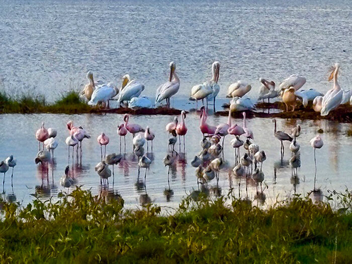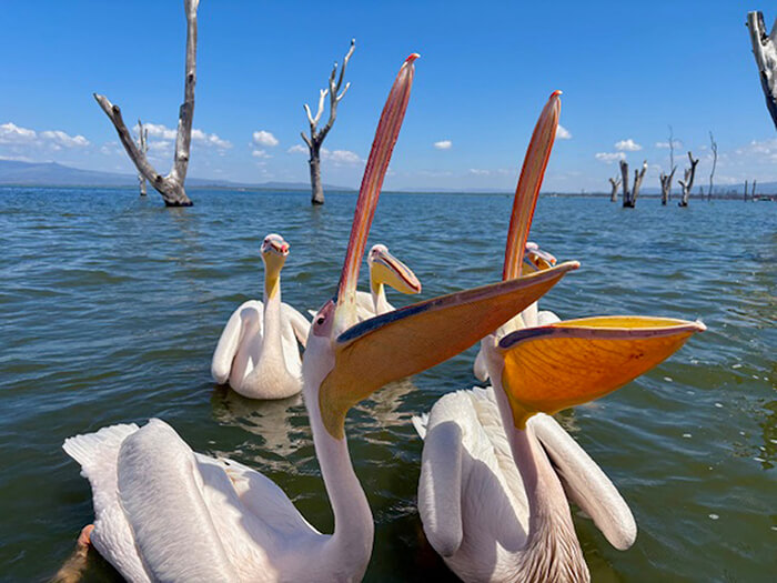 We reached Lake Nakuru close to sunset and, as stunning as it is, the lake is another victim of climate change. Because of the high water levels, many of the pink flamingos have moved to better feeding grounds. We were lucky to see maybe a dozen or so wading with pelicans and ibises, and their blush pink, mingling with the pelicans’ white and the sun’s orange reflection on the water, created a spectacular African vista I’ll never forget.