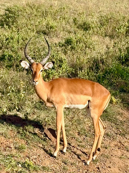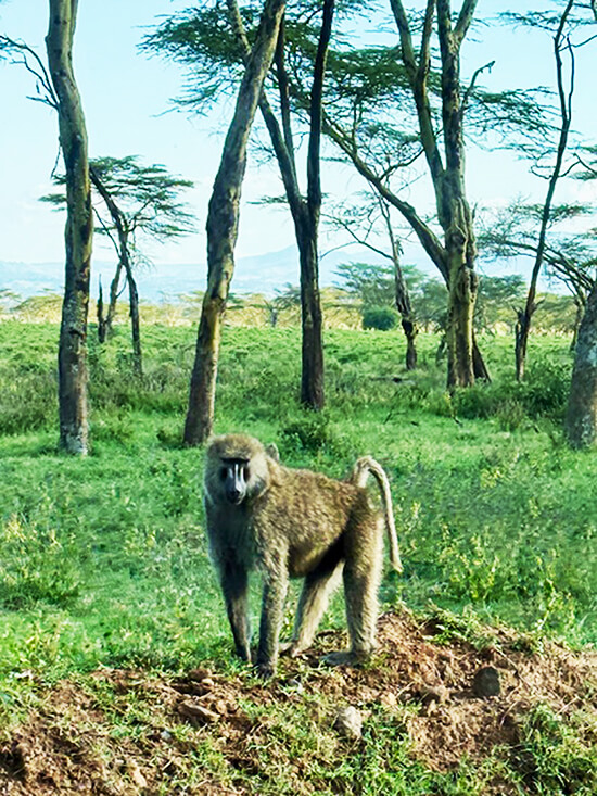 On the way, we were thrilled to see our first animals in the wild: a troop of baboons picking lice out of each other’s fur; graceful, horned impalas; and herds of zebras grazing by the side of the road. They all looked healthy, vibrant, and well-fed, unlike the miserable specimens you see in zoos. In fact, Kenya’s savanna looks like I imagine the Garden of Eden to be—lush and unspoiled, with enough resources to feed every creature.