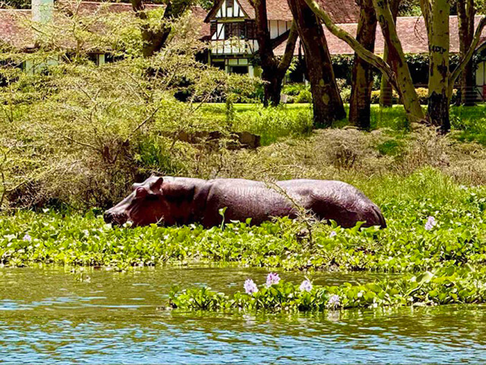 Our guide also noted that climate change has affected Africa’s lakes, making water levels rise dramatically. We were sad to see restaurants that were operational three years ago now half-underwater and abandoned, but happy to spot hippos surfacing in and out of the water. We also saw waterbucks, a horned relation of antelope, and were finally rewarded with sighting a full-grown hippo on the lake bank, its huge flanks glistening under the sun.