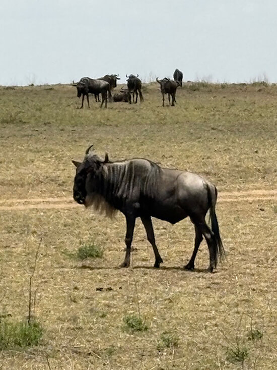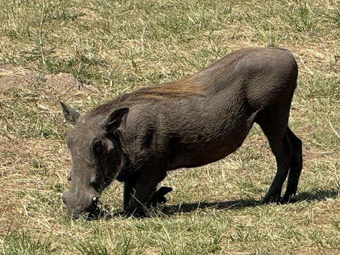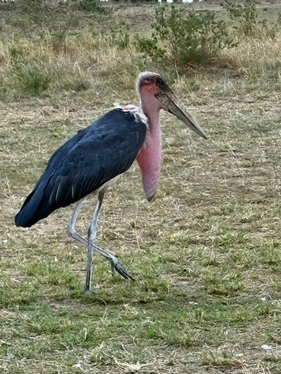 We saw an odd bird whose folded black wings resemble a vampire’s cape. Our guide identified it as a marabou stork, one of Africa’s five ugliest animals (according to an unofficial list compiled by safari guides). The other four include the spotted hyena, often seen as villains due to their eerie laugh and slumped appearance; wildebeest, which are stunning when they head the Great Migration but individually are awkward-looking with long faces and wispy beards; the warthog, with its wartlike facial growths and protruding tusks; and lappet-faced vulture, with its bald head and wrinkled pink neck. (Disclaimer: Though not conventionally attractive, all are important members of the ecosystem.)
