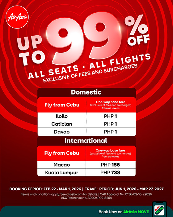 Now's your chance to tick off more destinations from your travel bucket list, as AirAsia is offering up to 99% off on fares across all domestic and international flights.