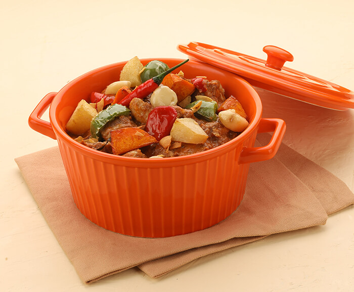 The Beef Caldereta features tender chunks of beef simmered in a rich, garlicky tomato sauce—best enjoyed with steamed rice.