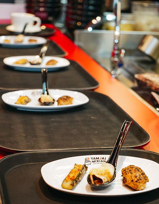 TamJai’s menu centers on mixian, noodles made from non-glutinous rice. The noodles carry a smooth, slippery texture that absorbs flavor without resistance. The ordering process follows the brand’s noodle cart system, a format inspired by Hong Kong street culture and built around choice. Diners begin by selecting a soup base and spice level, then move on to toppings that shape the character of the bowl.