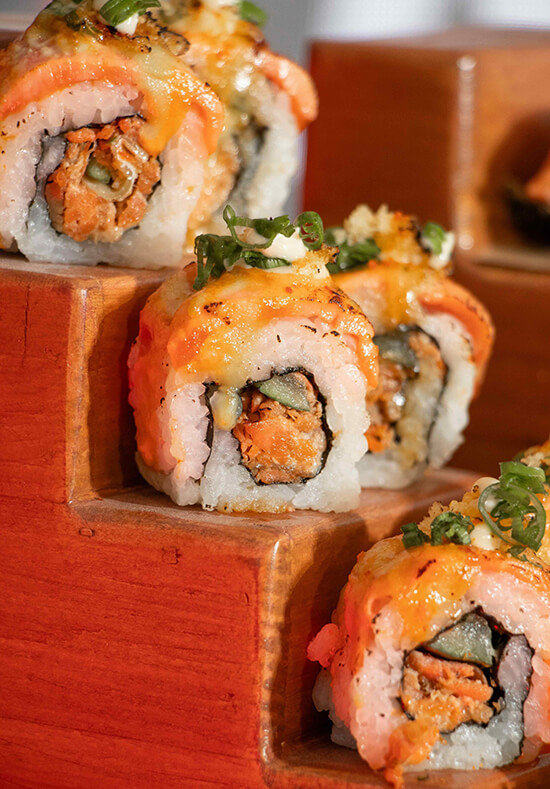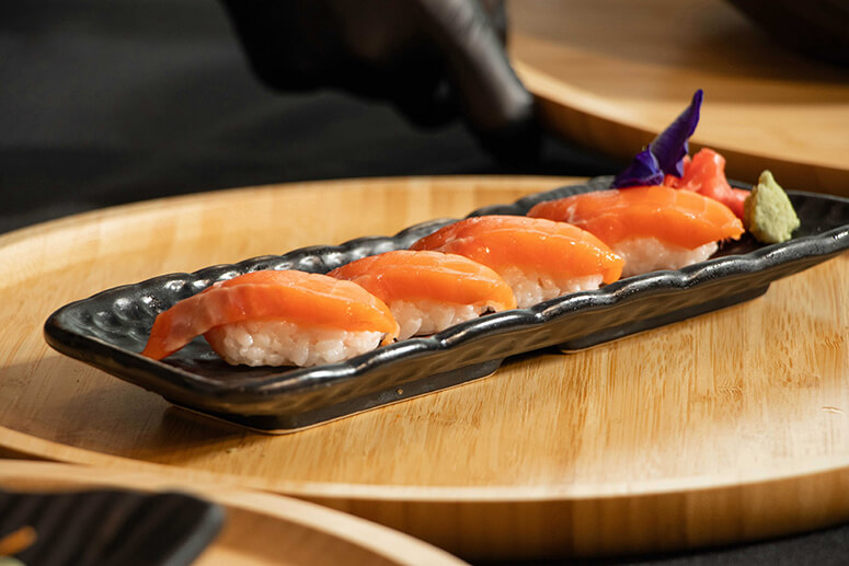 Beyond sashimi and flame-seared cuts, the menu introduces playful, modern expressions of the beloved fish. The Salmon Taco Aburi arrives stacked on a sushi ladder, before being dramatically torched tableside—a moment of theater that heightens both aroma and anticipation. Crisp, smoky, and indulgently layered, it’s a contemporary reinterpretation of salmon nigiri, delivering bold, modern flavor while retaining the comfort of a familiar favorite.