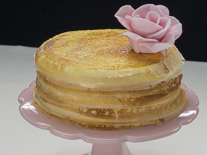 The layers yield gently: 20 paper-thin crepes stacked with cream and finished with a faint caramelized top. Each bite is soft, almost airy, dissolving into a quiet rhythm of crepe and cream.