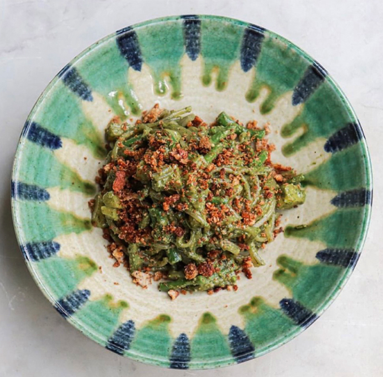 - Plate pasta in your chosen service bowl and sprinkle sourdough anchovy crumb on top.