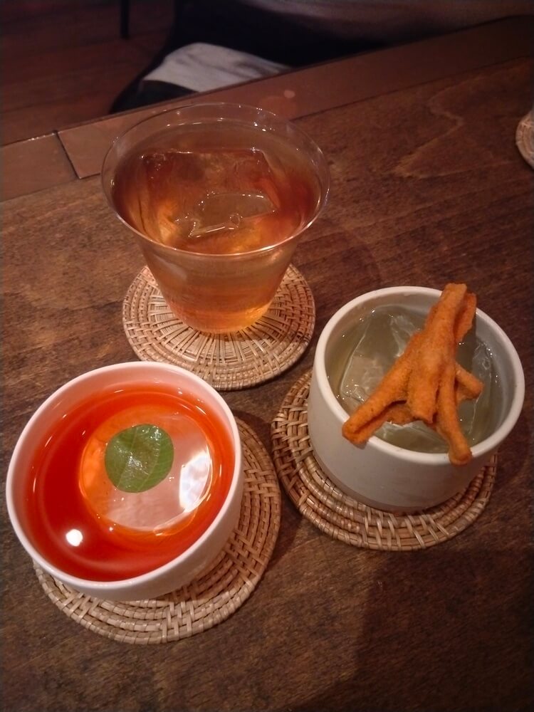 To showcase their artistry in serving vibrant flavors through foraged ingredients, you can try one of their most unique drinks: the Chicken + Rice (S$26 or P1,147), which is made with rice vodka, sesame, tomato, cucumber, distilled shoyu, calamansi, and blackened ginger. The drink is topped with chicken garum that is battered and shaped into the form of a chicken foot, a savory bite that enhances the drink’s cool, cucumber taste.