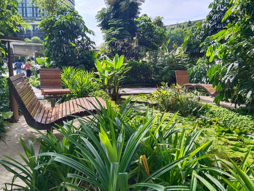 Beyond that, Geneo also has a variety of retail, dining, and lifestyle amenities, including an outdoor ginger-themed garden called The Seed. Here, visitors can explore a spectrum of colors, fragrances, and textures from a total of 22 plant species, many of which are part of the ginger family, a nod to their use in Singaporean culture. There are also lounge chairs that give a view of the pond filled with pink water lilies.