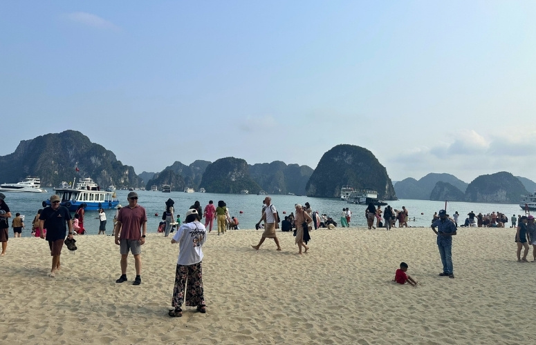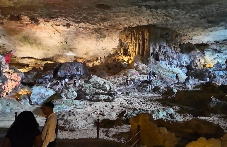 At the foot of Sung Sot Cave, Ha Long Bay’s largest cave, a climb of roughly 100 stone steps leads to the entrance. Despite its modest opening, the interior opens into a vast space covering approximately 10,000 sqm.