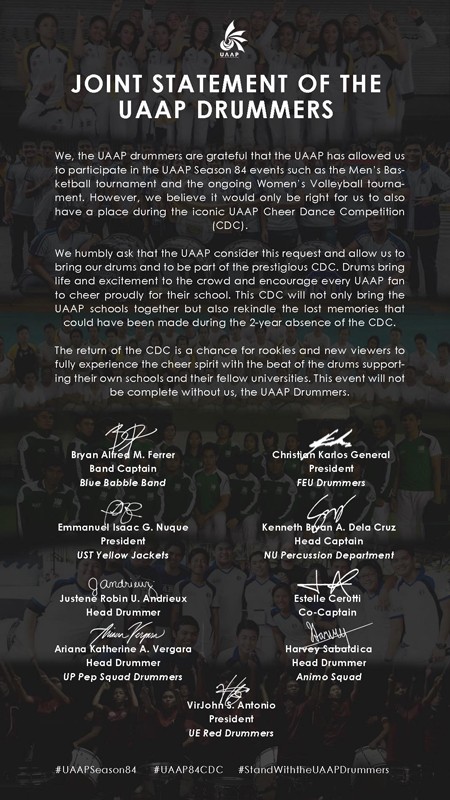 "We humbly ask that the UAAP consider this request and allow us to bring our drums and to be part of the prestigious CDC," their statement read.