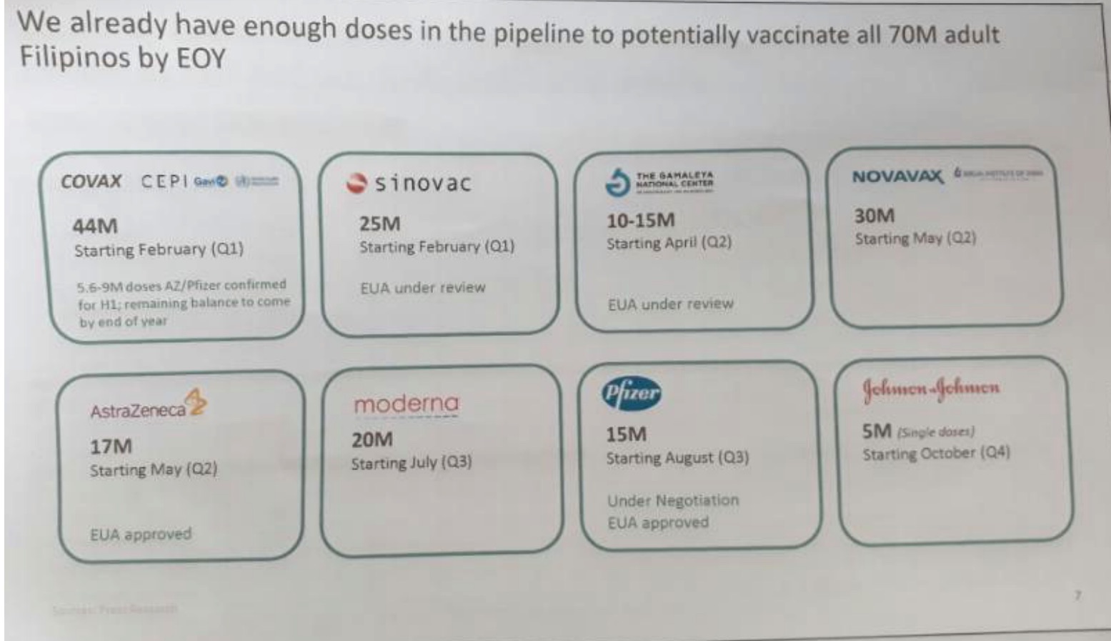 Last January, Galvez also said that they are already expecting 117,000 doses of Pfizer-BioNTech vaccines under COVAX by mid-February. Galvez said that the country stood to receive 9.4 million doses from COVAX from Pfizer-BioNTech and AstraZeneca within the first and second quarter.