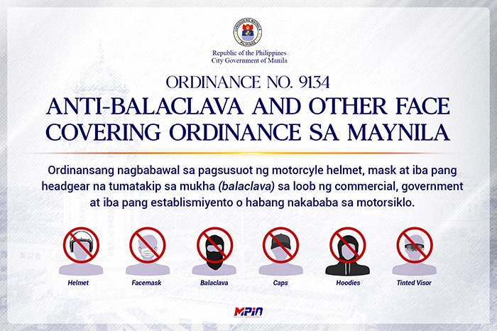 Wearing face-concealing headgear like helmets, facemasks, caps, and more inside commercial, government, and public establishments is no longer allowed in the city of Manila.