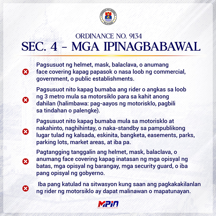 Helmets, other face-concealing headgear no longer allowed in gov't offices, public places in Manila