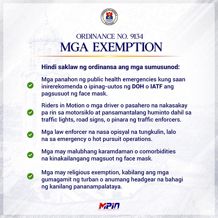 According to the ordinance, the face coverings are exempted for those with health comorbidities, persons who wear such items for religious reasons, and law enforcers in the official performance of their duties.