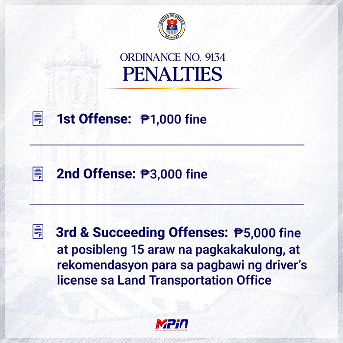 Violators could face a P1,000 fine on their first offense; a P3,000 fine and eight hours of community service on their second offense; and a P5,000 fine, 15-day imprisonment, or both, and a recommendation of revocation of their driver's license to the Land Transportation Office.