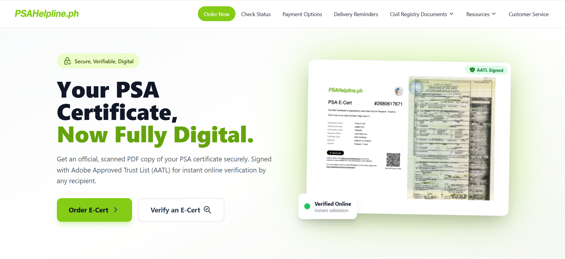 The e-certificate, as explained through an introductory video, is a "fully digital, cryptographically secured and legally recognized version" of PSA documents such as birth certificates, marriage certificates, death certificates, Certificate of No Marriage (CENOMAR) and Certificate of No Death (CENODEATH). It also possesses the same legal authority as the PSA-issued paper document.