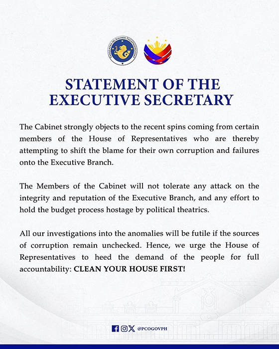 Executive Secretary Lucas Bersamin did not mince words when he defended the Executive Branch from "recent spins" coming from House of Representatives members amid the probe into flood control projects.