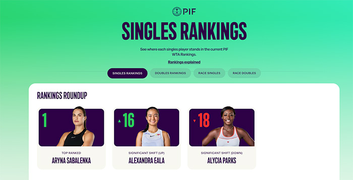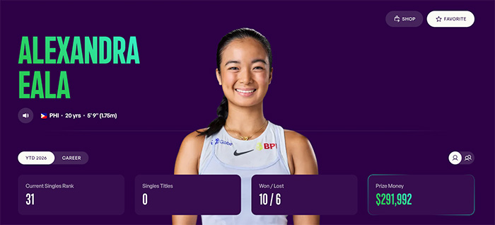 The WTA website highlighted Eala's rise on its ranking page, which showed Aryna Sabalenka as no. 1, the Filipina's 16-spot jump, and US player Alycia Park's 18-spot drop.