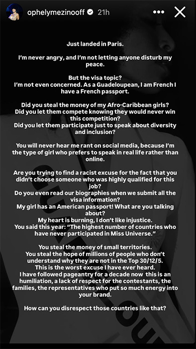 One Miss Universe 2025 candidate, Miss Guadaloupe Ophély Mézino, slammed Rocha's remarks.