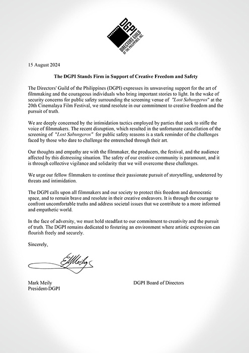 "In the wake of security concerns for public safety surrounding the screening venue of Lost Sabungeros at the 20th Cinemalaya Film Festival, we stand resolute in our commitment to creative freedom and the pursuit of truth," Mark Meily, DGPI president said.