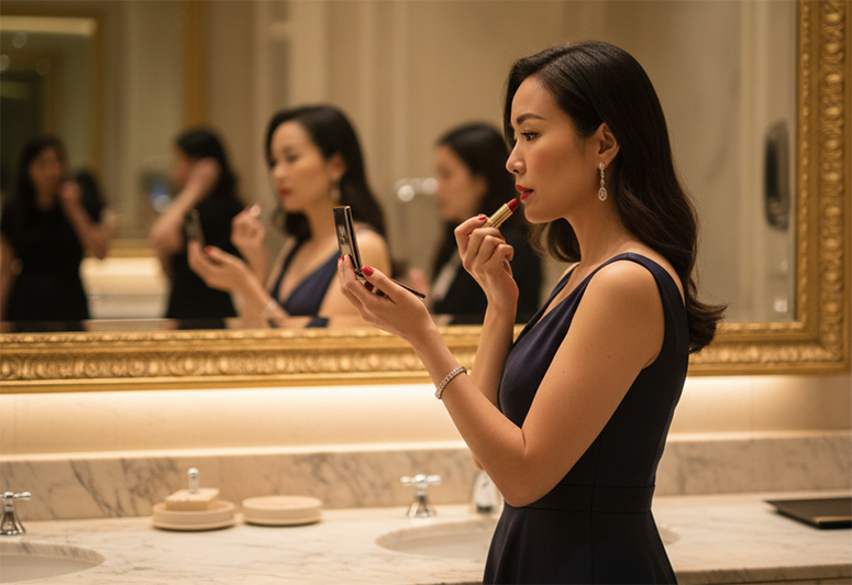 Question: Is it still the norm for women at social gatherings to go to the ladies’ room to retouch their lip color or makeup? I wonder about this, having recently observed some female guests at formal sit-down dinners nonchalantly doing this vanity ritual right at their table.