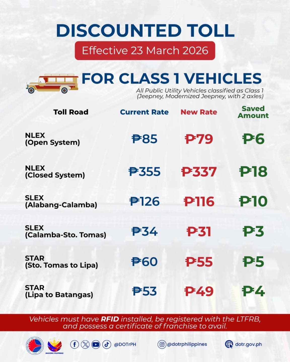 To avail of the discounts, Class 1 and Class 2 vehicles must have RFID installed, be registered with the LTFRB, and hold a certificate of franchise. Class 3 vehicles must also have the RFID installed.