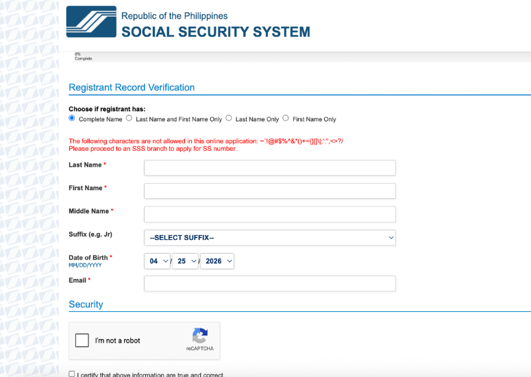 Be sure to read the instructions and before “Start.” Fill out all required fields in the Registrant Record Verification, then tick the security boxes confirming “I’m not a robot” and that your information is true and correct. In the security section, you will be asked to turn on your camera and imitate the hand gesture shown, so be sure to have your equipment ready. Afterwards, click “Submit.”