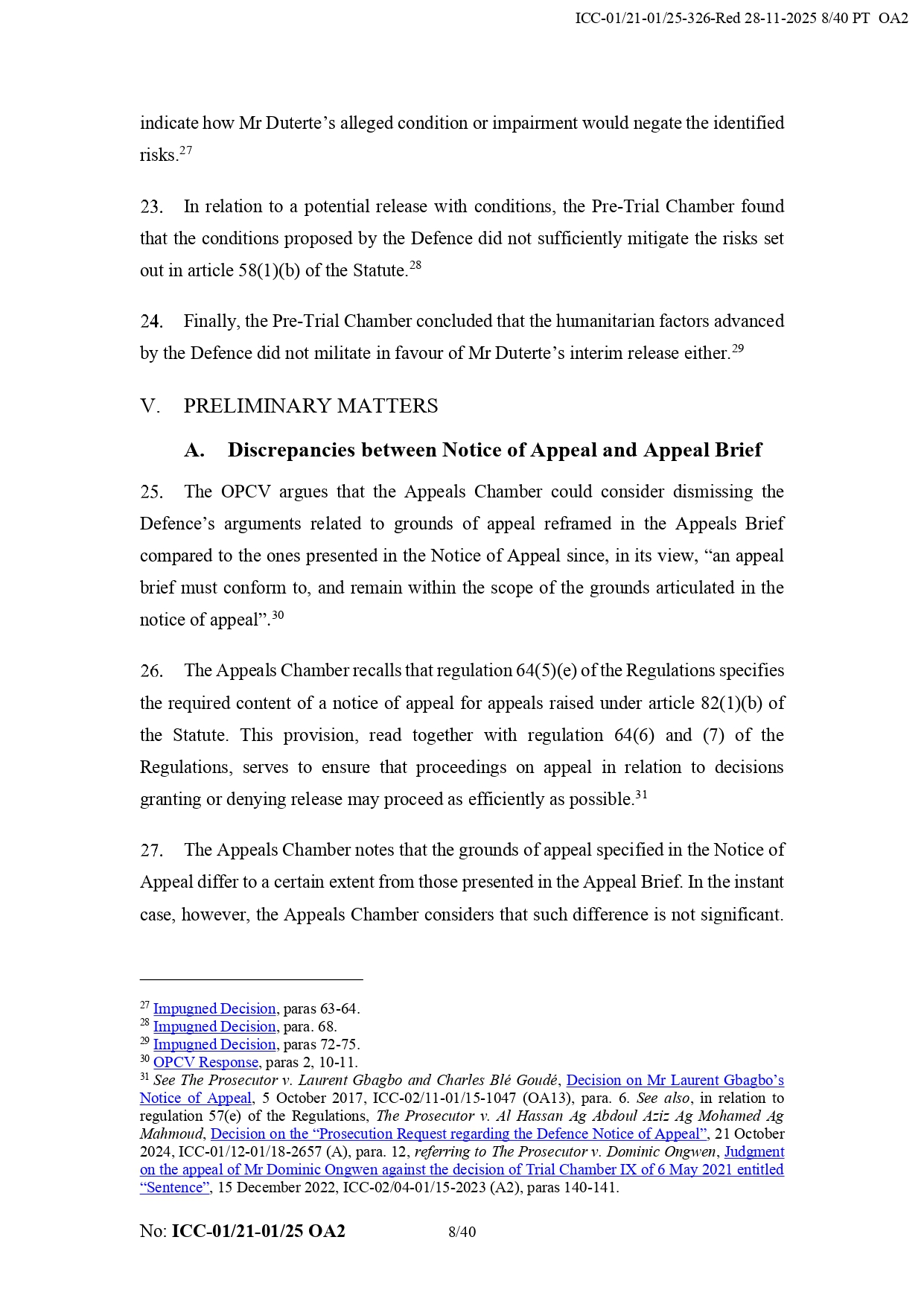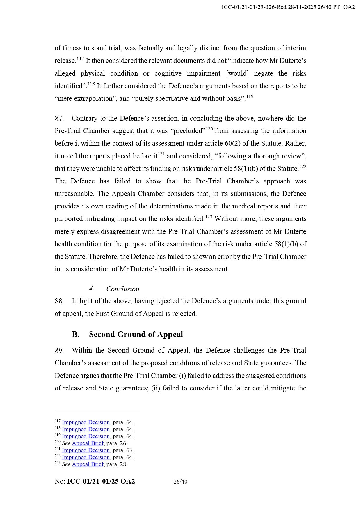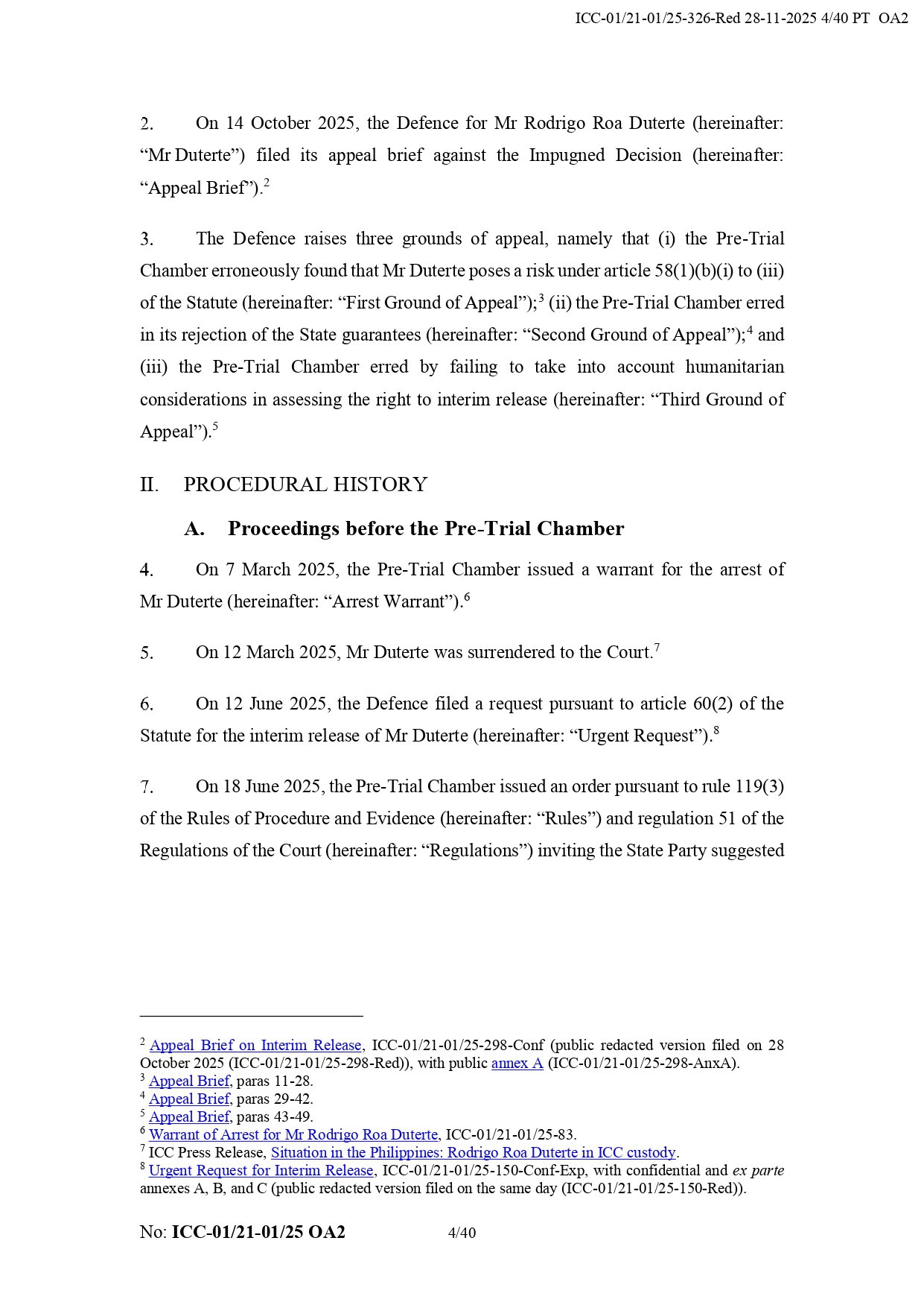 The International Criminal Court rejected grounds for Rodrigo Duterte's appeal for interim release.