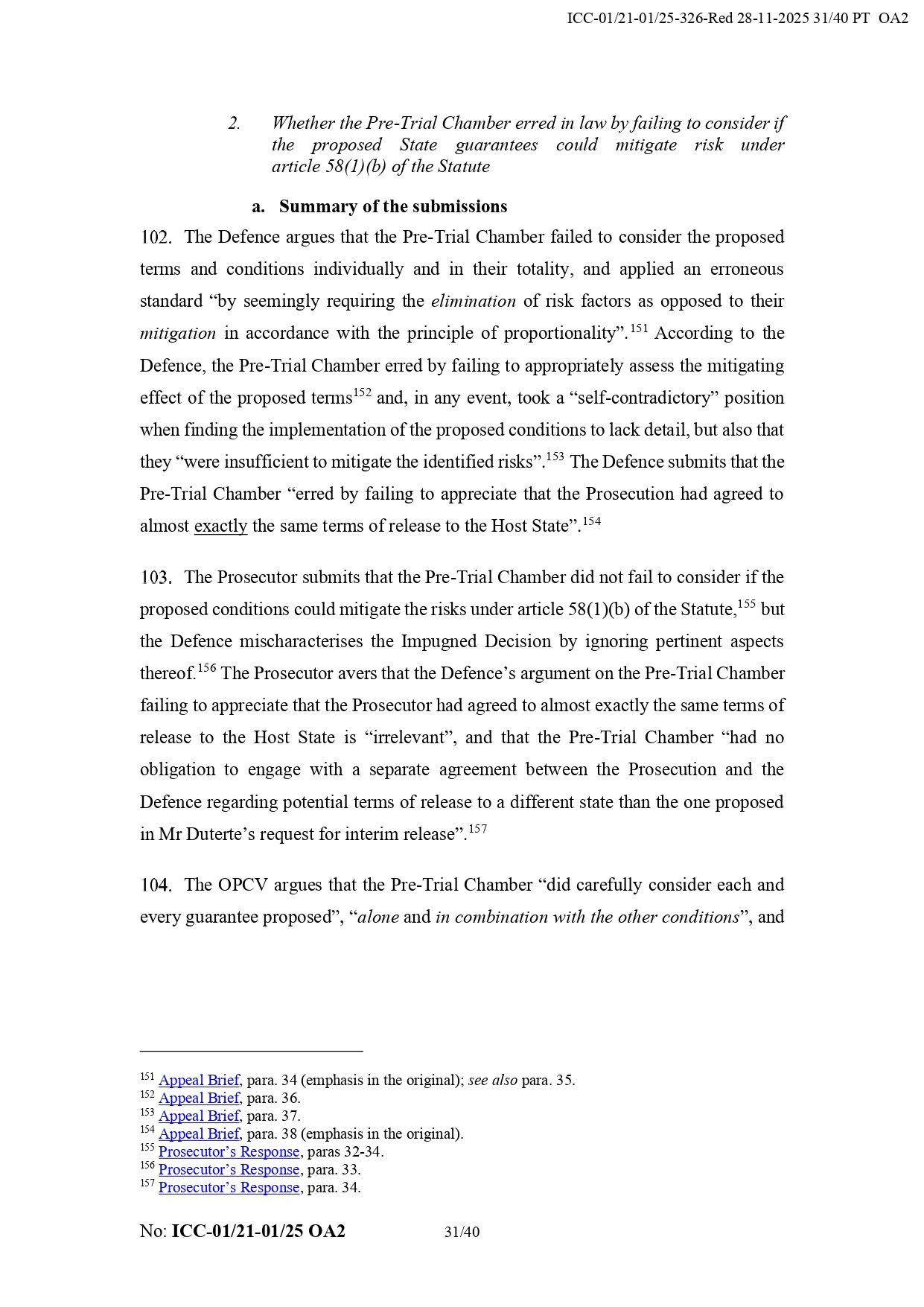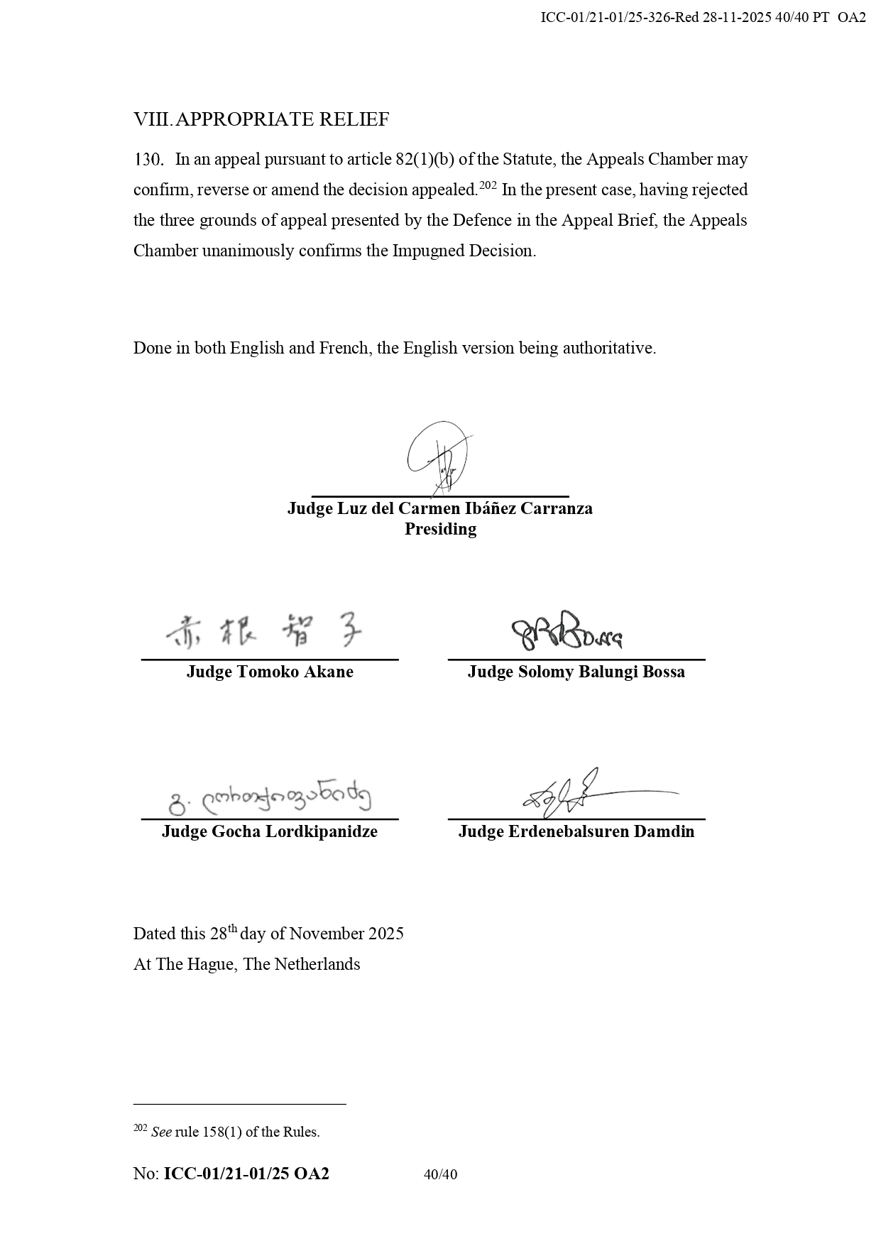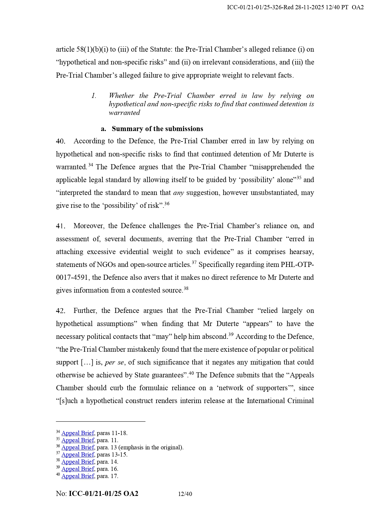 On Nov. 28, the tribunal upheld Pre-Trial Chamber I's September decision to deny Duterte's request for interim release, unanimously rejecting grounds of appeal by his defense team. It stressed that the former president must remain in ICC custody to secure his appearance at trial and to prevent potential witness intimidation and interference in the investigation.