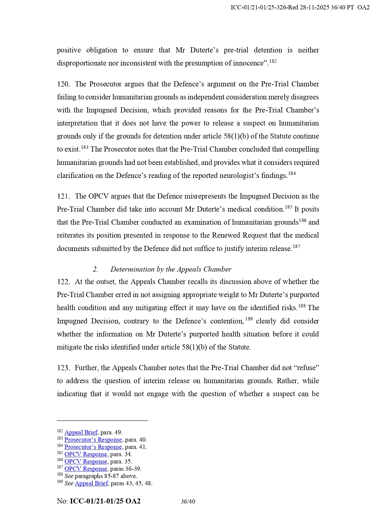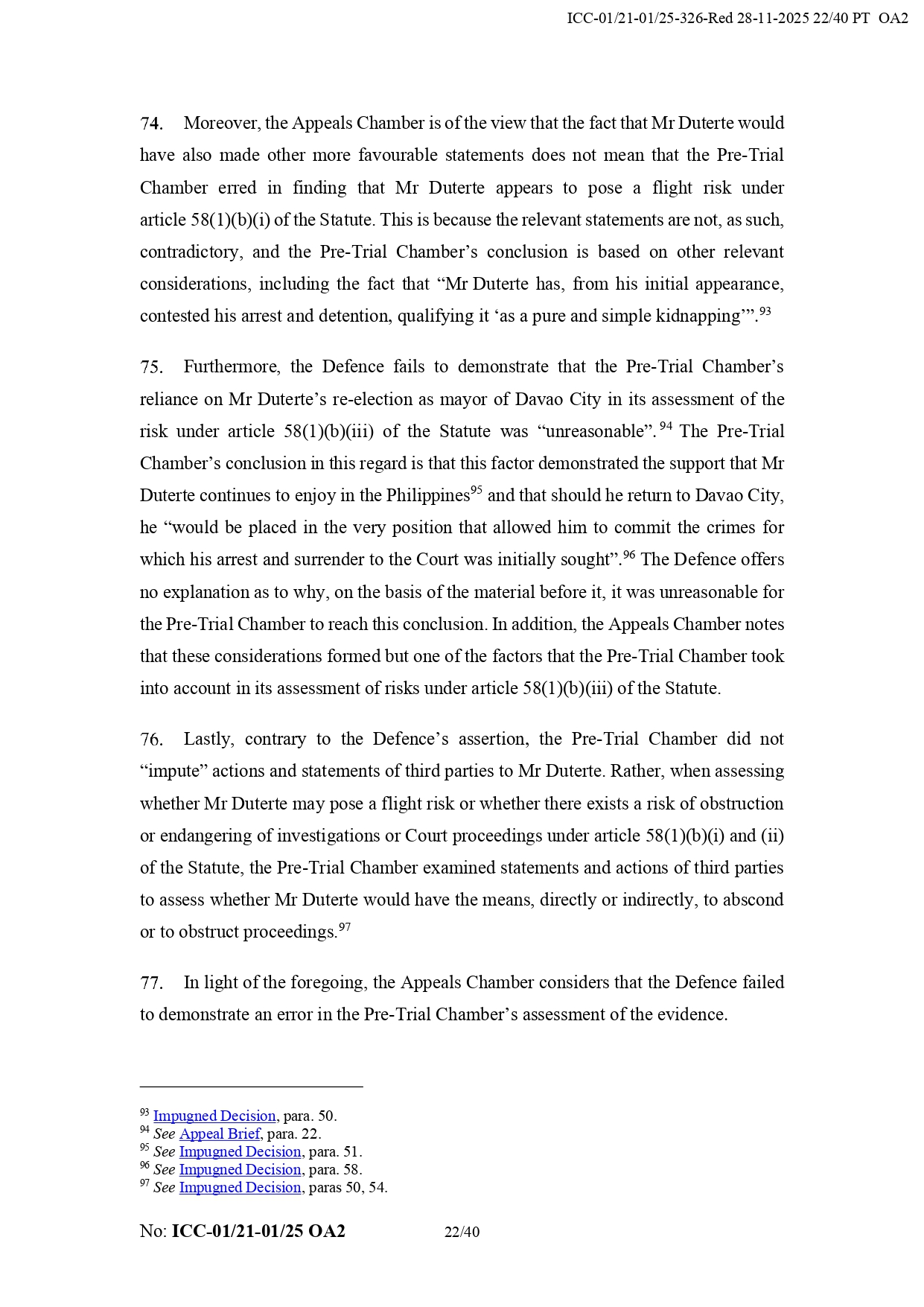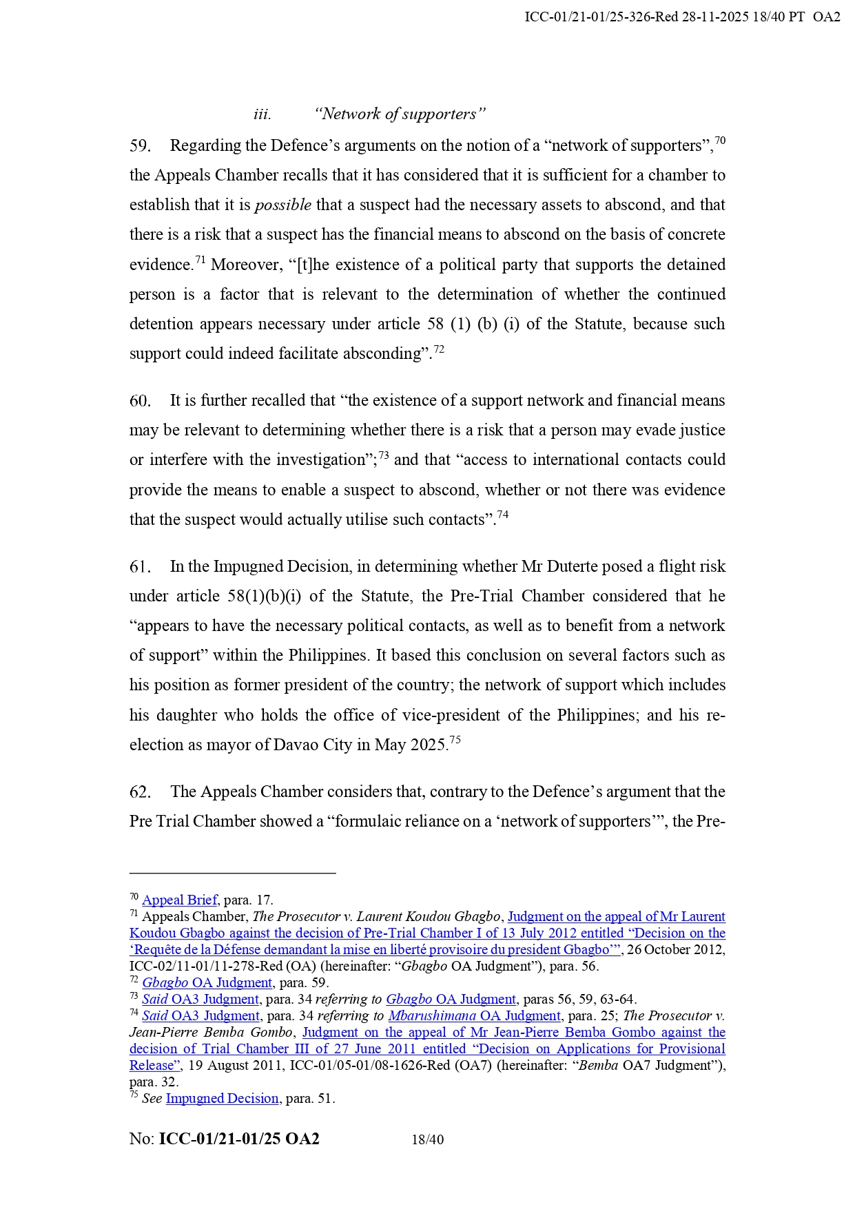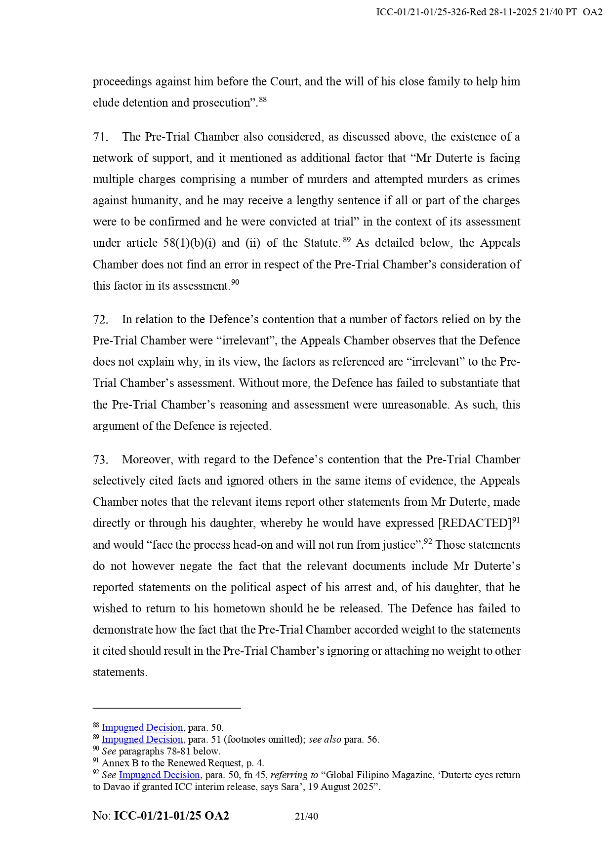 It added that Duterte “appears to have the necessary political contacts and appears to benefit a network of supporters from the Philippines.” It also noted that his legal team did not prove that the chamber failed to take humanitarian considerations into account regarding his detention.