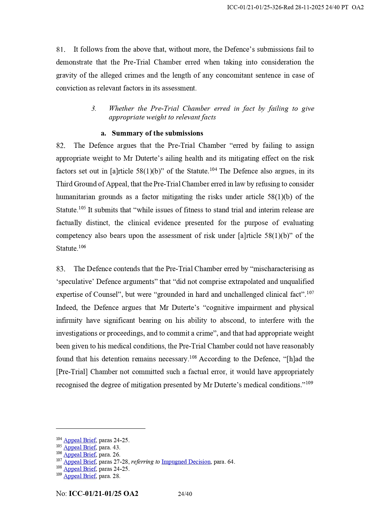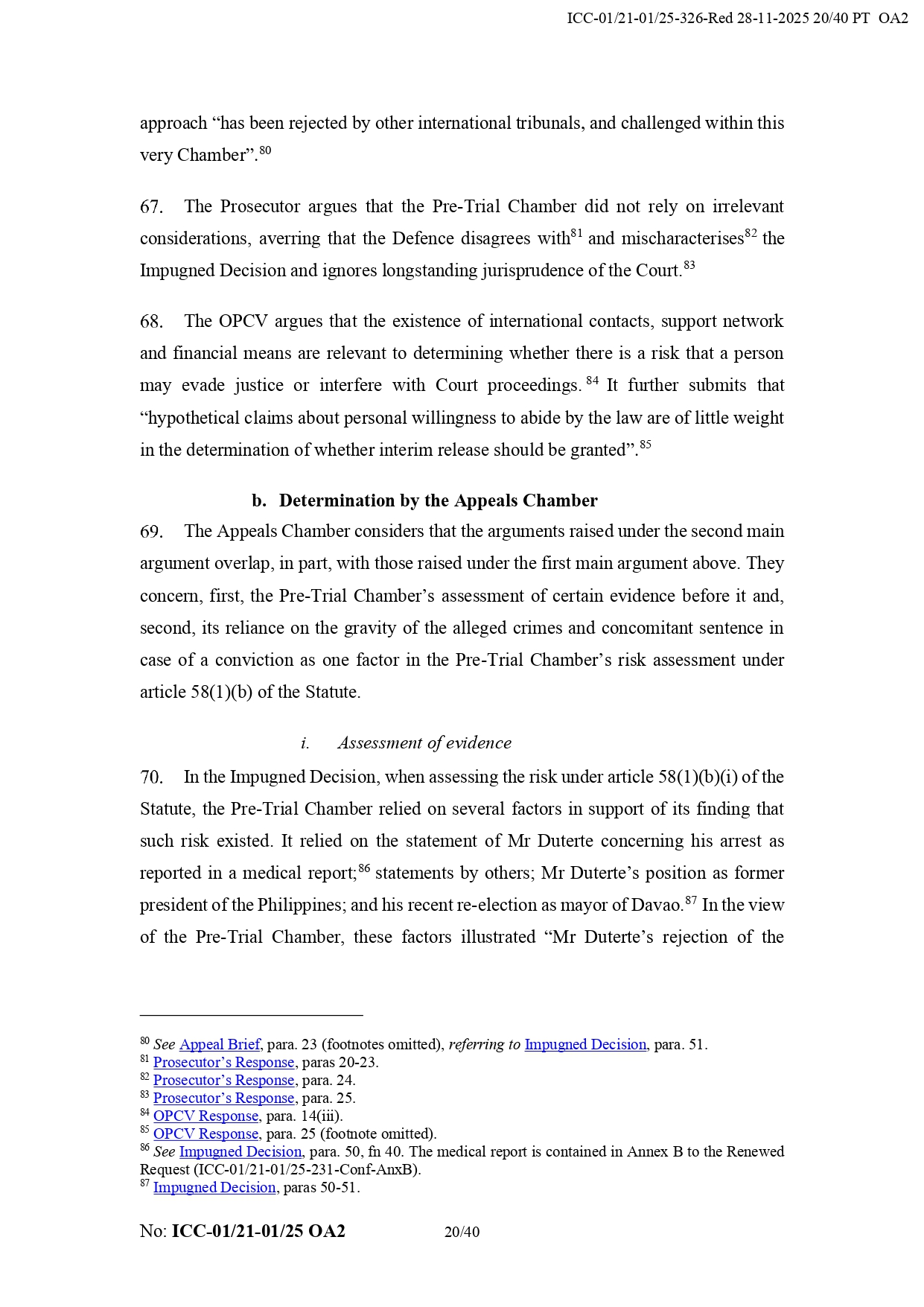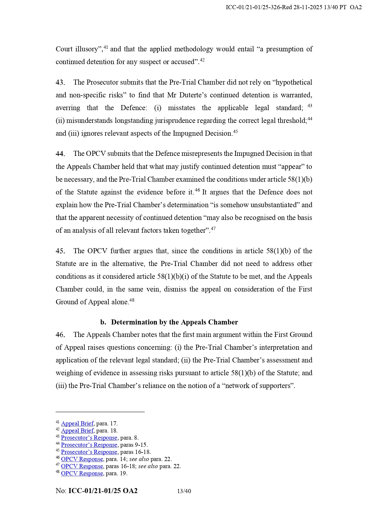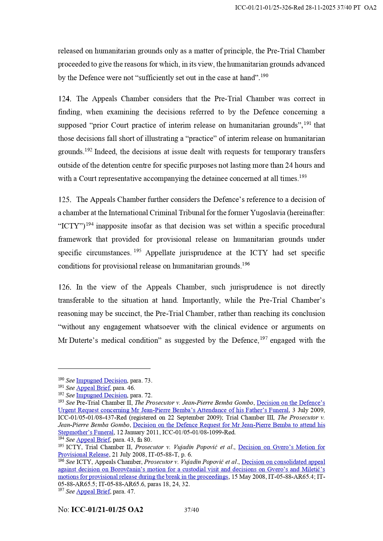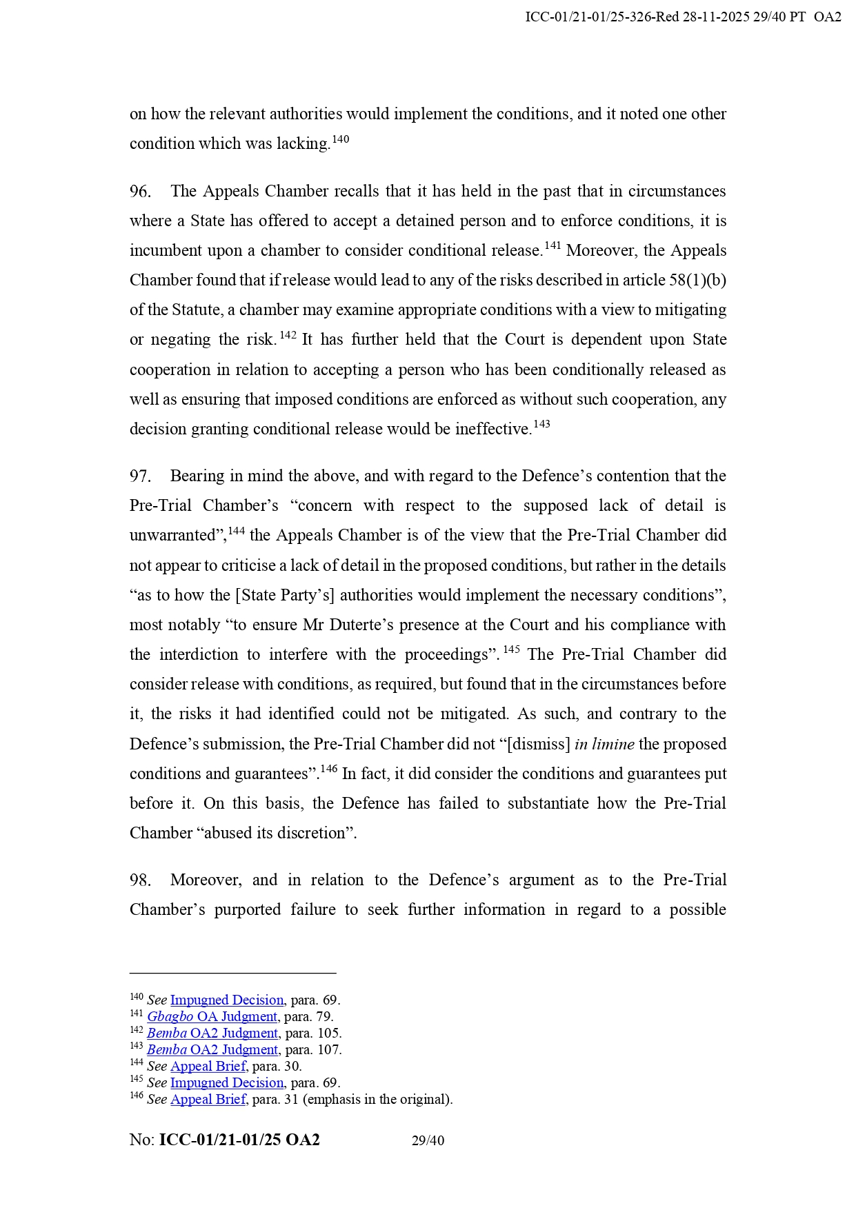 It added that Duterte “appears to have the necessary political contacts and appears to benefit a network of supporters from the Philippines.” It also noted that his legal team did not prove that the chamber failed to take humanitarian considerations into account regarding his detention.